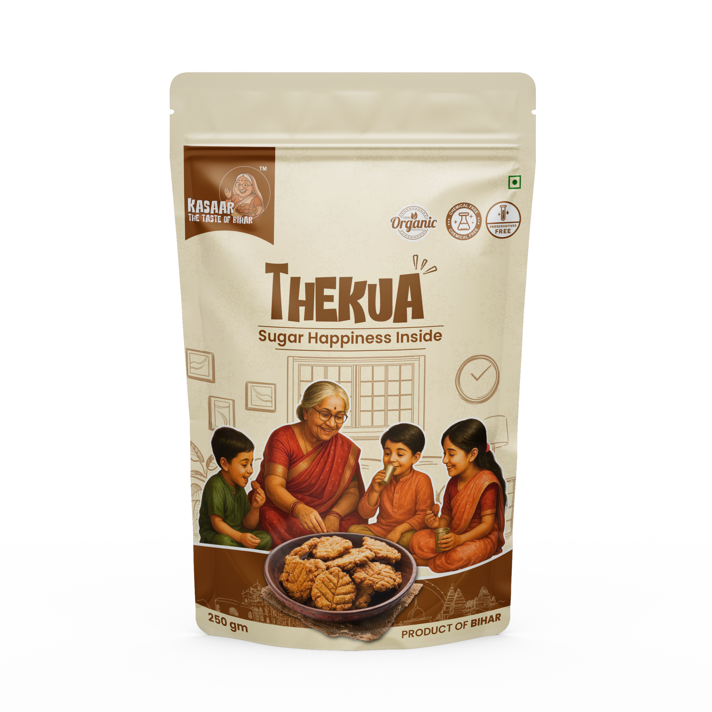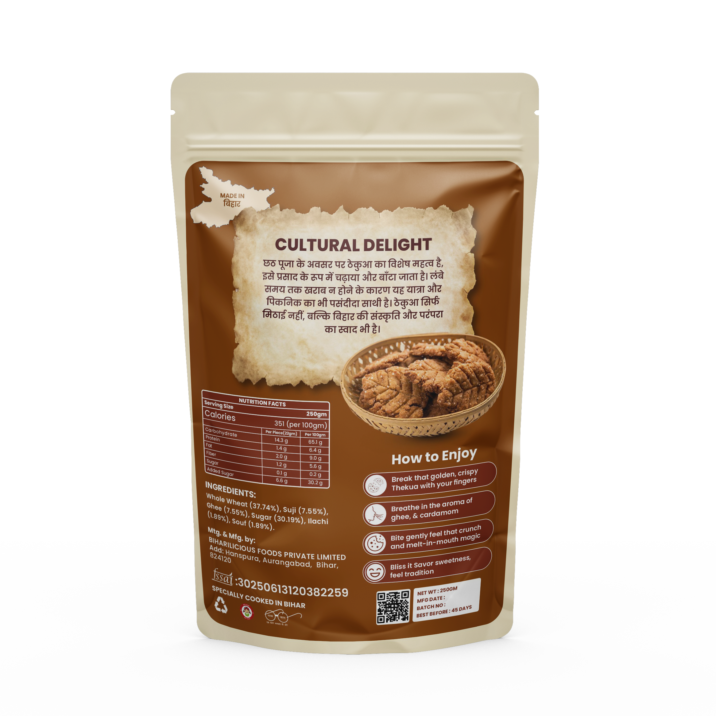 Inspired by the heritage shown on the product’s front image—children and grandmother sharing Thekua—this snack reflects the warmth, tradition, and love found in Bihari households.